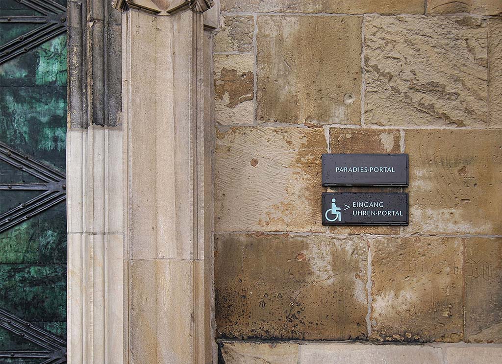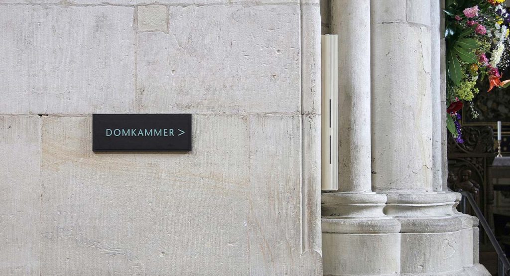 Parallel dazu entwickelten wir ein anspruchsvolles Leit- und Orientierungssystem, das sich mit besonderer Sensibilität in die Architektur des Domes einfügt. Das Design berücksichtigt die Materialitäten des Bauwerks – den warmen Sandstein und die kunstvollen schmiedeeisernen Details – und stellt sicher, dass jedes Element in die Räumlichkeit integriert ist, ohne diese zu dominieren. Das System ist funktional, bietet dem Besucher intuitiv verständliche Orientierung und vermittelt gleichzeitig einen ästhetischen Mehrwert, der das historische Ambiente der Kirche respektvoll unterstützt.