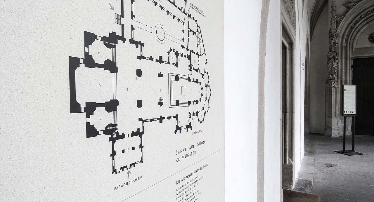 Für das St. Paulus Kapitel in Münster entwickelten wir eine ästhetisch und funktional ausgereifte Designlösung, die historische Erzählungen und moderne Orientierung nahtlos miteinander verbindet. Im sogenannten Paradies des Domes sind großflächige Tafeln umgesetzt worden, die die Geschichte der Seligen und Heiligen des Bistums Münster erzählen. Diese Tafeln fungieren nicht nur als informative Medien, sondern auch als integrative Elemente, die das historische Narrativ künstlerisch einbinden und die spirituelle Atmosphäre des Raumes erweitern.