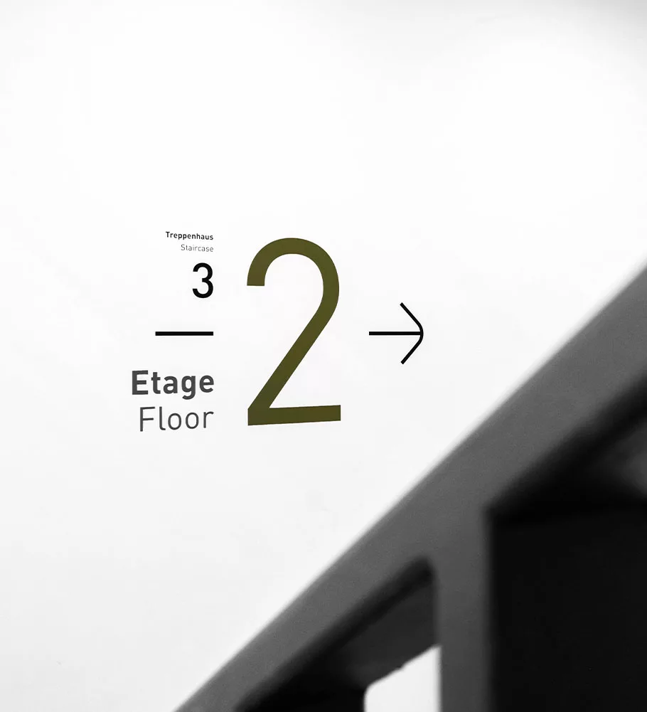 Ein auf das Interiordesign abgestimmtes Farbkonzept, eine präzise Typografie und eine klare Informationshierarchie stärken die visuelle Identität und sorgen für eine konsistente User Journey im gesamten Gebäude.