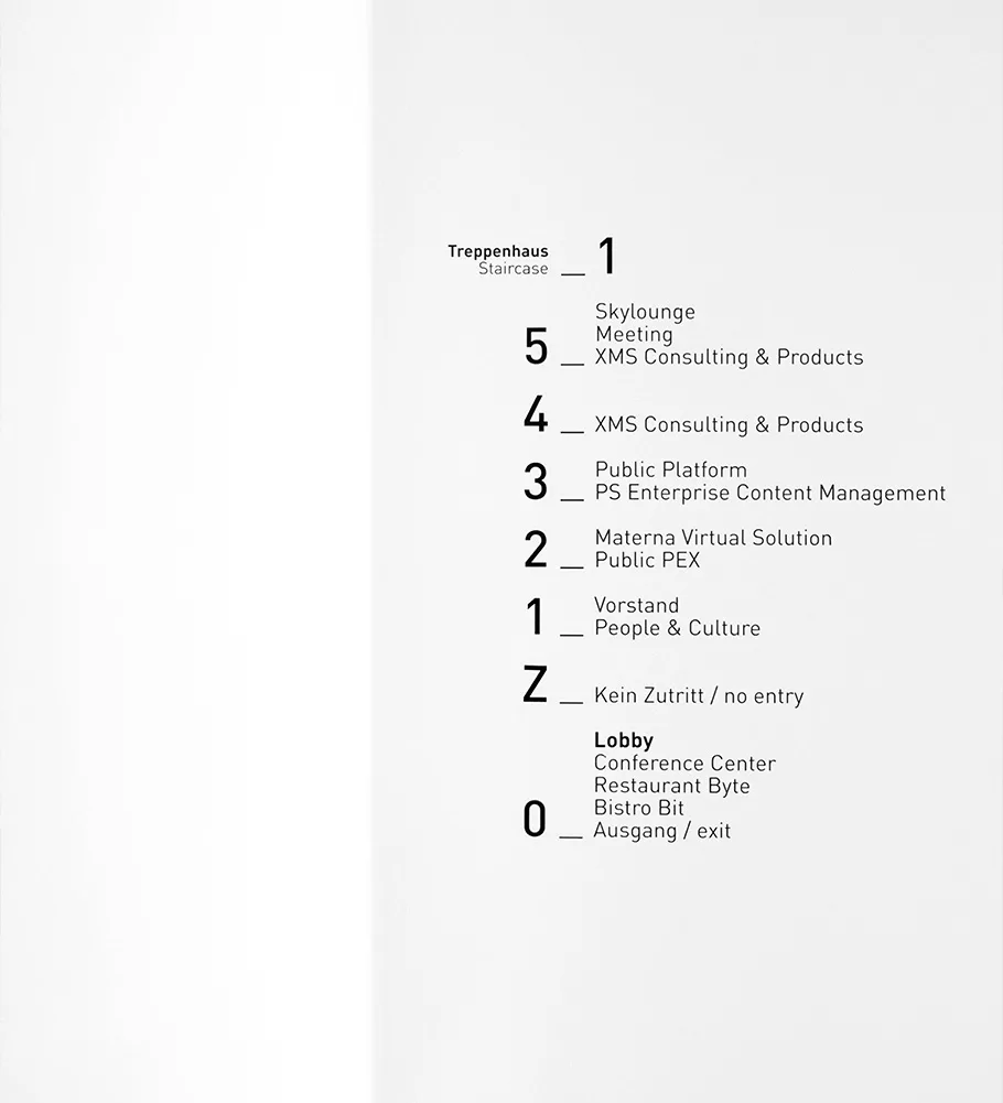 Das Materna Leitsystem erstreckt sich über Gebäude, Parkdecks und Innenhof und überzeugt durch eine durchdachte Benennungsstruktur, eigens entwickelte Icons und ein interaktionsfreundliches Design. Basierend auf der Materna-Hausschrift und abgestimmt auf das Interior-Design von pur.buero entstand ein visuelles Konzept, das klare Orientierung, Markenidentität und optimale Usability vereint.