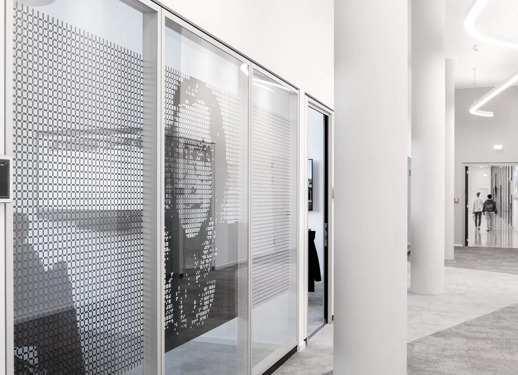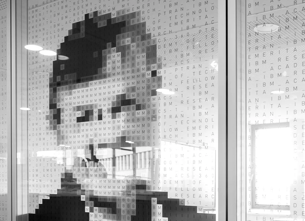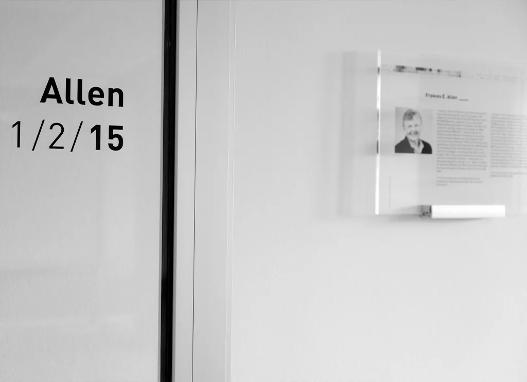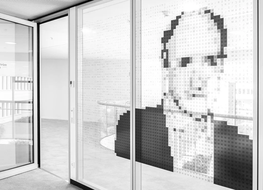 Für das neue Headquarter von Materna SE entwickelten wir – zusätzlich zum Leit- und Orientierungssystem – ein einzigartiges stereografisches Konzept, das die Errungenschaften bedeutender IT-Persönlichkeiten in eine innovative räumliche Gestaltung übersetzt. Die Glaselemente mehrerer Konferenzräume wurden mit Porträts wegweisender Denker:innen der IT-Geschichte versehen.