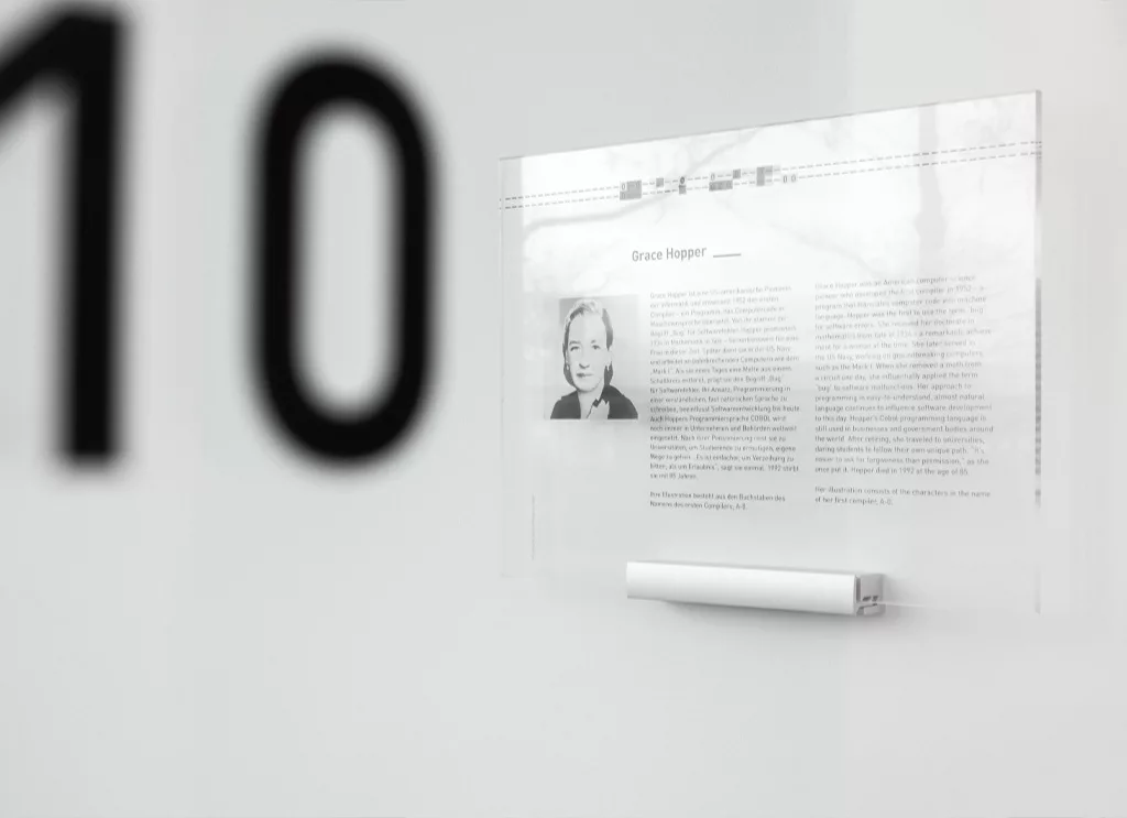 Diese Installation verbindet Informationsdesign mit interaktiver Architektur und schafft nicht nur einen funktionalen Sichtschutz, sondern auch eine visuelle Hommage an die digitale Pionierarbeit. So entsteht eine User Experience, die die Innovationskraft von Materna eindrucksvoll unterstreicht und das Materna Architekturkonzept zu einem ästhetischen und inhaltlichen Highlight macht.